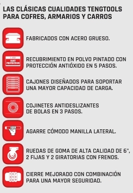 El Kit de servicio Tengtools con 140 piezas está equipado con guías de rodamiento, cierres de seguridad con combinación y dos asas laterales para su transporte.